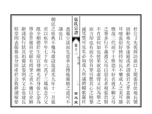 恨堂則表孺慕也分田產於合族耕讀嫁娶 辭謹按行狀其捐備試卷則承父志也建長 傳余昔備員史館有珥筆之責不獲以弇陋 既全順德於生前宜發幽光於身後乞余為 君以疾卒年七十有六其子三鳳痛念乃父 之旌典不幾為虛設哉道光九年十一月張 講也且 盡屬空談而先意承志博施備物之道可不 诚笃 而力却也有而不居負罪引慝其心之肫摯 不肖當何如也使果欲盜虛聲又何為舉之 之養多行不義遺父母以惡名者視張君賢 慨哉三代而下士惟恐不好名彼不顧父母 耳噫流俗好挾持短長不樂成人之美可勝 固辭弗允事遂寢或者謂張君之孝蓋務名 杜公