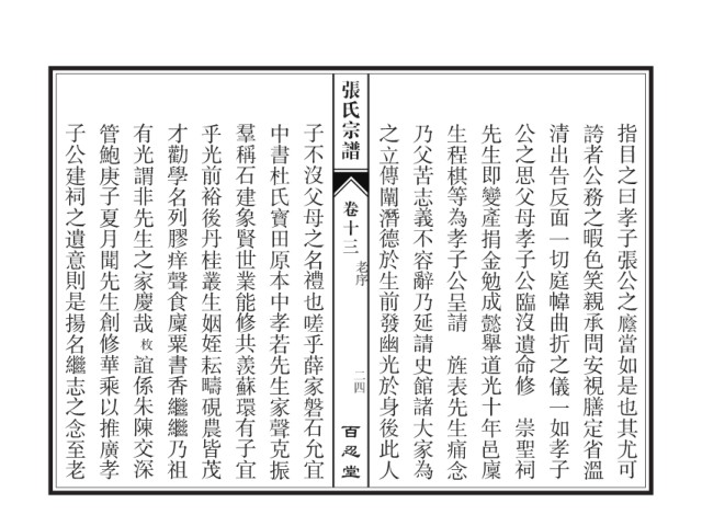 子公建祠之遺意則是揚名繼志之念至老 管鮑庚子夏月聞先生創修華乘以推廣孝 有光謂非先生之家慶哉 才勸學名列膠痒聲食廩粟書香繼繼乃祖 乎光前裕後丹桂叢生姻姪耘疇硯農皆茂 羣稱石建象賢世業能修共羨蘇環有子宜 中書杜氏寳田原本中孝若先生家聲克振 子不沒父母之名禮也嗟乎薛家磐石允宜 之立傳闡潛德於生前發幽光於身後此人 乃父苦志義不容辭乃延請史館諸大家為 生程棋等為孝子公呈請 先生即變產捐金勉成懿舉道光十年邑廩 公之思父母孝子公臨沒遺命修 清出告反面一切庭幃曲折之儀一如孝子 誇者公務之暇色笑親承問安視膳定省溫 指目之曰孝子張公之廕當如是也其尤可