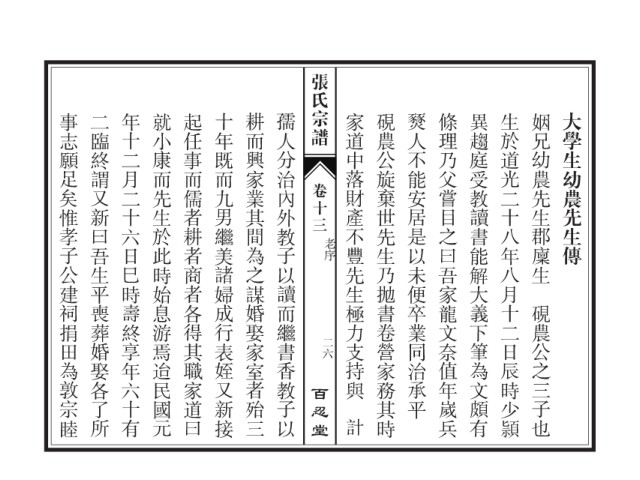 事志願足矣惟孝子公建祠捐田為敦宗睦 二臨終謂又新曰吾生平喪葬婚娶各了所 年十二月二十六日巳時壽終享年六十有 就小康而先生於此時始息游焉迨民國元 起任事而儒者耕者商者各得其職家道曰 十年既而九男繼美諸婦成行表姪又新接 耕而興家業其間為之謀婚娶家室者殆三 孺人分治內外教子以讀而繼書香教子以 家道中落財產不豐先生極力支持與 硯農公旋棄世先生乃拋書卷營家務其時 燹人不能安居是以未便卒業同治承平 條理乃父嘗目之曰吾家龍文奈值年嵗兵 異趨庭受教讀書能解大義下筆為文頗有 生於道光二十八年八月十二日辰時少頴 姻兄幼農先生郡廩生 大學生幼農先生傳