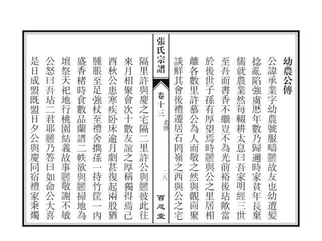 是日成盟既盟日夕公與慶同宿禮家秉燭 公怒曰吾玷二君耶 壇祭天祀地行桃園結義故事 盛香楮時食數品蘭譜二帙欲與 腫脹至足強杖至禮舍擕孫一持竹筐一內 酉秋公患寒疾卧床逾月劇甚復起兩股猶 來月相聚會次十數友誼之厚稱獨得焉己 隔里許與慶之宅隔二里許公與 談鮮其會後禮遷居石罔嶺之西與公之宅 離各數里許慕公為人而敬之然與覿靣聚 於後世子孫有厚望焉時 至吾而書香不繼豈不為光前裕後玷歟當 儒就農業然每輟耕太息曰吾家明經三世 捻亂陷強虜厯年數乃歸邇時家貧年長棄 公諱承業字幼農號服疇 幼農公傳