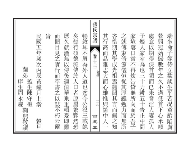 民國五年嵗次丙辰黃鐘月上澣 旹 而聞目見之實行而卒書之以誌不朽云爾 厯久就湮無以傳後適值華乘重輯爰即 矣懿行碩德流傳於人口者原屬繁夥然恐 暢敘耳不屑為外人道也迄今公沒三載餘 其行高而品雅志大而心雄惟與箇中人一 吝惜期其學成光祖焉 之就傅束脩節儀恒從其厚雖勉力而無所 家境窶日嘗不再炊告貸無所向而於吾子 子燬人家室為也三十力耕五十告止中間 虜意以期得保首領而已未嘗淫人妻孤人 營弱冠始歸數年之久不過低首下心承順 端坐命子姪侍立歡談生平苦况童龄陷虜