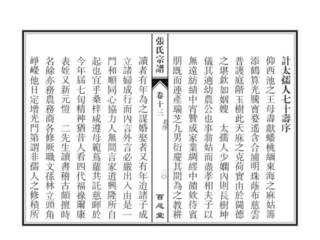 崢嶸他日定增光門第謂非孺人之修積所 名餘亦務農務商各修厥職文孫林立頭角 表姪又新元愷 今年屆七旬精神猶昔人看四代福祿爾康 起也宜乎桑梓咸遵母範蔦蘿共託慈暉於 門和順同心協力人無間言家道興隆所自 立諸婦成行而內言外言必嚴出入由是一 讀者有年為之謀婚娶者又有年迨諸子成 朋既而連產瑞芝九男衍慶其間為之教耕 無遠紡績中宵贊成家業綢繆中饋欸待賓 儀其適幼農公也事翁姑而盡孝相夫子以 之堪欽如姻嫂 普護庭階玉樹此天庥之克荷實由於閫德 添鶴算光騰寳婺遙含合浦明珠蔭布慈雲 仰西池之王母壽獻蟠桃緬東海之麻姑籌 計太孺人七十壽序