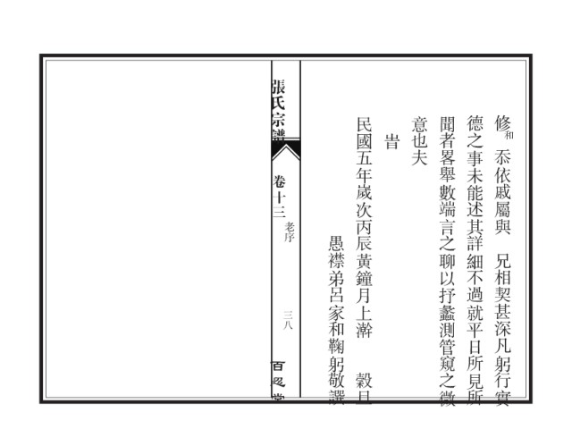 张氏宗谱 民國五年嵗次丙辰黃鐘月上澣 意也夫 聞者畧舉數端言之聊以抒蠡測管窺之微 德之事未能述其詳細不過就平日所見所 修 旹 和 忝依戚屬與 卷十三 老序 愚襟弟呂家和鞠躬敬譔 兄相契甚深凡躬行實 三八 百忍堂 穀旦