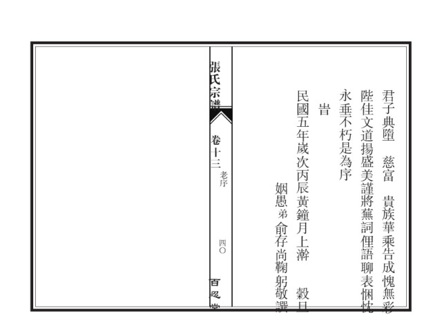 张氏宗谱 民國五年嵗次丙辰黃鐘月上澣 永垂不朽是為序 陛佳文道揚盛美謹將蕪詞俚語聊表悃忱 君子典墮 旹 卷十三 慈富 老序 姻愚 貴族華乘告成愧無彩 弟 俞存尚鞠躬敬譔 四〇 百忍堂 穀旦