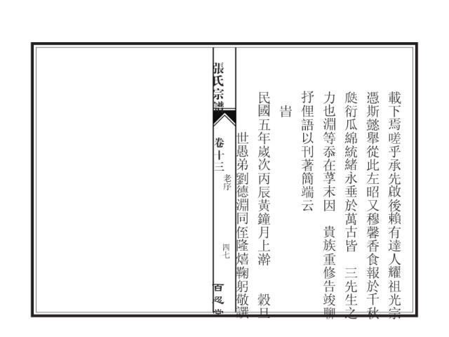 张氏宗谱 民國五年嵗次丙辰黃鐘月上澣 抒俚語以刊著簡端云 力也淵等忝在莩末因 瓞衍瓜綿統緒永垂於萬古皆 憑斯懿舉從此左昭又穆馨香食報於千秋 載下焉嗟乎承先啟後賴有達人耀祖光宗 旹 世愚弟劉德淵同侄隆熺鞠躬敬譔 卷十三 老序 貴族重修告竣聊 四七 三 百忍堂 先 穀旦 生 之