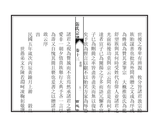 民國五年嵗次丙辰黃鐘月上澣 旹 敢云序 為壽又自愧其簡且褻也爰書之以贈諸君 愛非一朝夕值貴族舉行大典予吝一言以 諸君之視為贅旈而不喜焉然承諸君之雅 矣予欲為俚言以獻不以貽笑方家為辱恐 子巳為刪簡之率皆盡善盡美而無以復加 達者宣子已為闡揚之字多而語冗懈者宣 光前裕後功莫與京云云間有意是而祠未 舒望族與其何時受姓代有偉人並諸君之 為傳或為贊其秉筆宗 族貽謀善也批其外間所贈之文或為序或 世後之尊卑有辨親