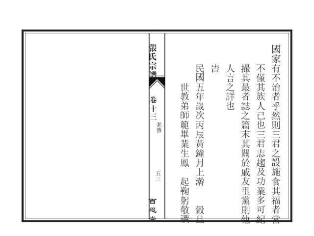 张氏宗谱 國家 民國五年嵗次丙辰黃鐘月上澣 旹 人言之詳也 撮其最者誌之篇末其關於戚友里黨則他 不僅其族人已也三君志趨及功業多可紀 有不治者乎然則三君之設施食其福者當 世教弟師範畢業生鳳 卷十三 老傳 起鞠躬敬譔 五三 百忍堂 穀旦