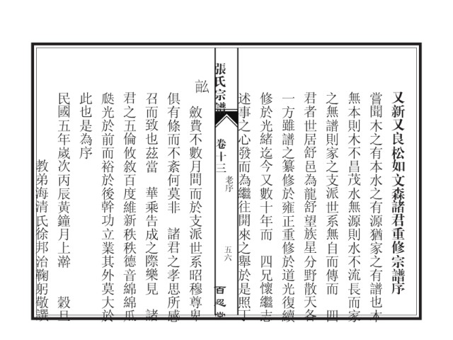 民國五年嵗次丙辰黃鐘月上澣 此也是為序 瓞光於前而裕於後幹功立業其外莫大於 君之五倫攸敘百度維新秩秩德音綿綿瓜 召而致也茲當 俱有條而不紊何莫非 述事之心發而為繼往開來之舉於是照丁 修於光緒迄今又數十年而 一方雖譜之纂修於雍正重修於道光復續 君者世居舒邑為龍舒望族星分野散天各 之無譜則家之支派世系無自而傳而 無本則木不昌茂水無源則水不流長而家 嘗聞木之有本水之有源猶家之有譜也木 又新又良松如文森諸君重修宗譜序