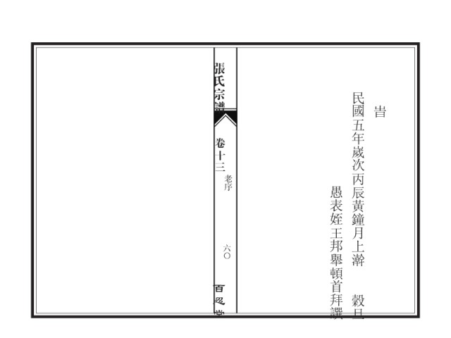 张氏宗谱 民國五年嵗次丙辰黃鐘月上澣 旹 卷十三 老序 愚表姪王邦舉頓首拜譔 六〇 百忍堂 穀旦