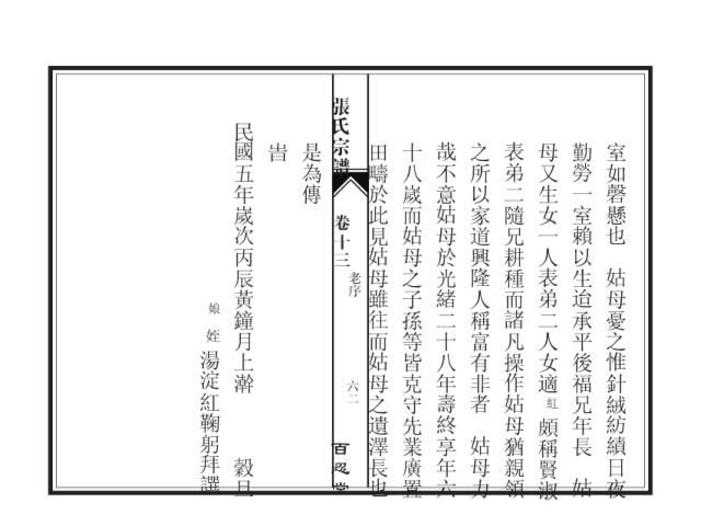 张氏宗谱 民 國五年嵗次丙辰黃鐘月上澣 旹 是為傳 田疇於此見姑母雖往而姑母之遺澤長也 十八嵗而姑母之子孫等皆克守先業廣置 哉不意姑母於光緒二十八年壽終享年六 之所以家道興隆人稱富有非者 表弟二隨兄耕種而諸凡操作姑母猶親領 母又生女一人表弟二人女適 勤勞一室賴以生迨承平後福兄年長 室如磬懸也 卷十三 姑母憂之惟針絨紡績日夜 老序 娘 姪 湯淀紅鞠躬拜譔 六二 紅 頗稱賢淑 姑母力 百忍堂 穀旦 姑