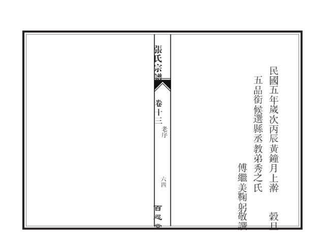 张氏宗谱 民國五年嵗次丙辰黃鐘月上澣 五品銜候選縣丞教弟秀之氏 卷十三 老序 傅繼美鞠躬敬譔 六四 百忍堂 穀旦