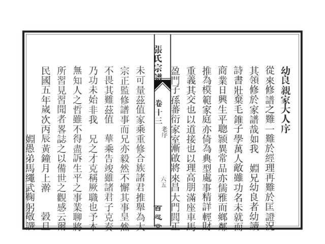 民國五年嵗次丙辰黃鐘月上澣 所習見習聞者畧誌之以備世之觀感云爾 無知人之哲雖不得盡訴生平之事業聊將 乃功未始非我 不畏其難茲值 宗正監修譜事而兄亦毅然不懈其事皇然 未可量茲值家乘重修合族諸君推舉為大 盈門子孫蕃衍家室漸啟將來昌大門閭正 重義其交也以道接也以理高朋滿座車馬 推為模範家庭亦倚為典型處事精詳輕財 商業日興生平聰颕異常品亦儒雅而鄉鄰 詩書壯棄毛錐子學萬人敵雖功名未就而 其領修於家譜哉如我 從來修譜之難一難於經理再難於匡證況 幼良親家大人序