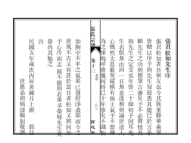 张氏宗谱 民國五年嵗次丙辰黃鐘月上澣 旹 偉尚其勉之 予心冷而志 世風不古又有甚於當日者松如又將何如 如胸中不平之氣果已發舒淨盡耶而今之 為之悚嗚呼曾幾何時巳十年事矣不識松 心慨然太息歌哭縱橫有俠士氣予不禁神 生名恨無由靣一日無意逢相與論世道人 與先生之定交也年皆二十餘初予固耳先 顧先生之功與德眾言審矣予不必贅憶吾 皆贈以序予與先生知最悉其能巳於言乎 張君松如者吾密友也今其族重修華乘眾 張君松如先生序 卷十三 餒不能與若輩爭榮辱先生英 老傳 世愚弟胡炳濤鞠躬敬譔 六七 百忍堂 穀旦
