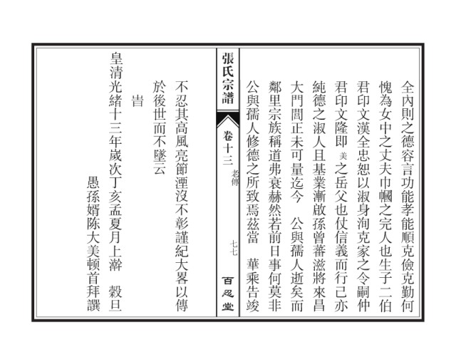 皇清 张氏宗谱 光緒十三年嵗次丁亥孟夏月上澣 於後世而不墜云 不忍其高風亮節湮沒不彰謹紀大畧以傳 公與孺人修德之所致焉茲當 鄰里宗族稱道弗衰赫然若前日事何莫非 大門閭正未可量迄今 純德之淑人且基業漸啟孫曾蕃滋將來昌 君印文隆即 君印文漢全忠恕以淑身洵克家之令嗣仲 愧為女中之丈夫巾幗之完人也生子二伯 全內則之德容言功能孝能順克儉克勤何 旹 卷十三 美 之岳父也仗信義而行己亦 老傳 愚孫婿陈大美顿首拜譔 公與孺人逝矣而 七七 華乘告竣 百忍堂 穀旦