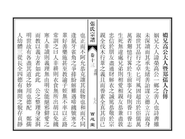人幼體三從長全四德有幽閒之貌存貞靜 明世故有各盡其道之妙用也德配 而教以義方者如此此 寒人非讀則義理無由明安能絕邪僻愛之 常訓之曰人非耕則衣食無所出胡以免饑 輩好善樂施甚至教諭子姪無不率以正路 逢鼠牙雀角之爭排紛解難遇啼饑號寒之 也正而不阿允恭克讓其接物也和而不同 親全伐木行葦之義且而養素全真其治己 忠信於朋友盡通財解衣之誠篤恭敬於宗 生死無違處兄弟則相愛相親友恭兼盡敦 萬者廽憶行畧於生前事父母則養口養志 淑世其品行之卓匕可風固超出於俗儒萬 未深讀而其承先緒善詒謀立德立言淑身 姻兄大人諱榮高公一鄉之善人也詩書雖 婣兄高公大人暨郑孺人合傳