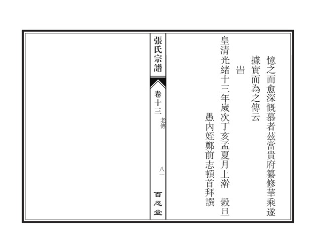 张氏宗谱 皇清 光緒十三年嵗次丁亥孟夏月上澣 據實而為之傳云 憶之而愈深慨慕者茲當貴府纂修華乘遂 旹 卷十三 愚內姪鄭前志頓首拜譔 老傳 八一 百忍堂 穀旦