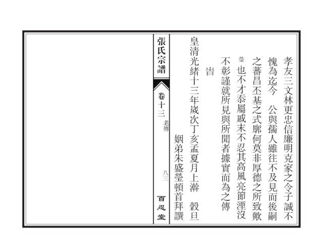 张氏宗谱 皇清 光緒十三年嵗次丁亥孟夏月上澣 不彰謹就所見與所聞者據實而為之傳 瑩 之蕃昌丕基之式廓何莫非厚德之所致歟 愧為迄今 孝友三文林更忠信廉明克家之令子誠不 旹 也不才忝屬戚末不忍其高風亮節湮沒 卷十三 公與孺人雖往不及見而後嗣 老傳 姻弟朱盛瑩頓首拜譔 八三 百忍堂 穀旦