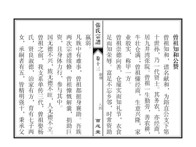 女,承嗣者有五,皆精明强干,秉承父 氏,贤良淑德,治家有方,育有七子两 曾祖之前,我支系单传三代,曾祖娶杨 国无德不兴,族无德不旺,人无德不立。 资,且身体力行,参与其中。 两次宗谱续修,曾祖慷慨解囊,捐助巨 凡族中有难事,曾祖都挺身襄助。吾族 羸弱。 足而知荣辱。富足不忘乡邻,时常资助 曾祖崇德向善,仓廩实而知礼节,衣食 业殷实,称甲一方。 牛壮仓满;曾祖懂经商,生意兴隆,家 居九井湾张院。曾祖一生勤劳,善农耕, 十世孙,乃一代贤士。其务农,亦经商, 曾祖知和,谱名献和,为鎔直公支下第 曾祖知和公赞