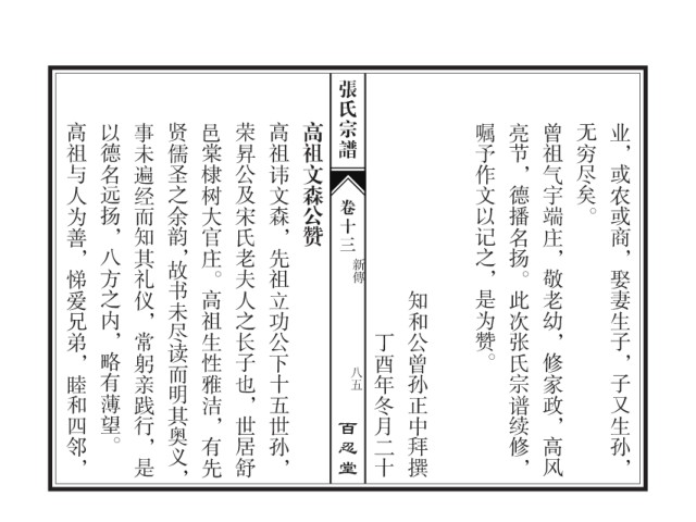 张氏宗谱 高祖与人为善,悌爱兄弟,睦和四邻, 以德名远扬,八方之内,略有薄望。 事未遍经而知其礼仪,常躬亲践行,是 贤儒圣之余韵,故书未尽读而明其奥义, 邑棠棣树大官庄。高祖生性雅洁,有先 荣昇公及宋氏老夫人之长子也,世居舒 高祖讳文森,先祖立功公下十五世孙, 高祖文森公赞 嘱予作文以记之,是为赞。 亮节,德播名扬。此次张氏宗谱续修, 曾祖气宇端庄,敬老幼,修家政,高风 无穷尽矣。 业,或农或商,娶妻生子,子又生孙, 卷十三 新傳 知和公曾孙正中拜撰 丁酉年冬月二十 八五 百忍堂