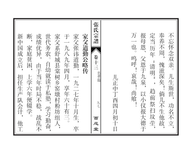 新中国成立后,担任生产队会计,他工 断,家庭贫困,上学六年便辍学。 成绩优异,由于当年时局不稳,战乱不 世代务农。自幼就读于私塾,学习勤奋, 家父系舒城县棠树乡窑墩村粉坊组人, 于一九八九年四月,享年六十有三。 家父张讳道勤,一九二七年十月生,卒 家父道勤公略传 万一也。呜呼!哀哉!尚飨! 报母恩、父恩于九泉,以小仪报大德于 定当历年 奉养不周,愧滋深矣!倘儿不生他故, 不忘怀念双亲。儿生斯世,功名不立,