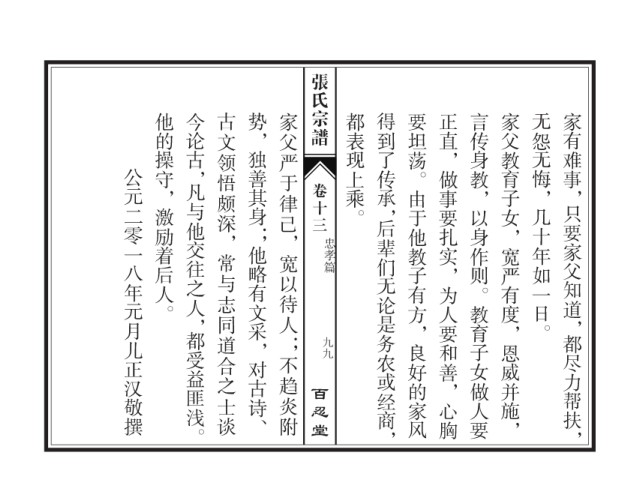 张氏宗谱 他的操守,激励着后人。 今论古,凡与他交往之人,都受益匪浅。 古文领悟颇深,常与志同道合之士谈 势,独善其身;他略有文采,对古诗、 家父严于律己,宽以待人;不趋炎附 都表现上乘。 得到了传承,后辈们无论是务农或经商, 要坦荡。由于他教子有方,良好的家风 正直,做事要扎实,为人要和善,心胸 言传身教,以身作则。教育子女做人要 家父教育子女,宽严有度,恩威并施, 无怨无悔,几十年如一日。 家有难事,只要家父知道,都尽力帮扶, 公元二零一八年元月儿正汉敬撰 卷十三 忠孝篇 九九 百忍堂