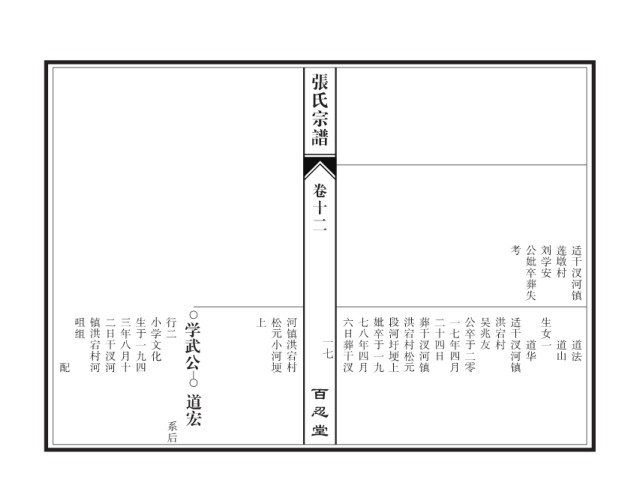 张氏宗谱 卷十二 考 公妣卒葬失 刘学安 莲墩村 适干汊河镇 咀组 镇洪宕村河 二日干汊河 三年八月十 生于一九四 小学文化 行二 学武公 上 松元小河埂 河镇洪宕村 六日葬干汊 七八年四月 妣卒于一九 段河圩埂上 洪宕村松元 葬干汊河镇 二十四日 一七年四月 公卒于二零 吴兆友 洪宕村 适干汊河镇 生女一 一七 道华 道法 道山 配 百忍堂 道宏 系后
