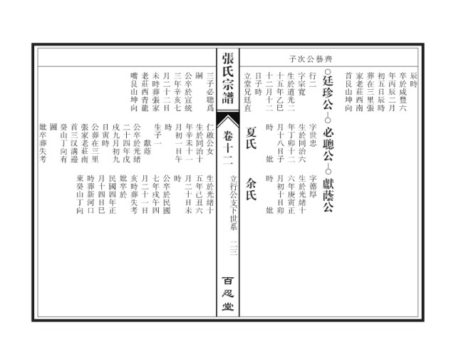 嘴艮山坤向 老莊西青龍 未時葬張家 月二十二日 三年辛亥七 公卒於宣統 嗣 三子必聰爲 立堂兄廷直 日子時 十二月十二 十五年乙巳 生於道光二 字宗寬 行二 廷珍公 首艮山坤向 家老莊西南 葬在三里張 初五日辰時 年丙辰二月 卒於咸豐六 辰時