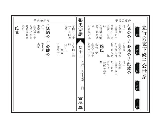 氏陳 時妣 月初四日巳 九年己亥七 生於道光十 字宗應 行二 廷炳公 失考 一日辰時葬 年四月二十 卒於同治九 嗣 長子必應爲 立胞弟廷炳 時 月初五日未 四年甲午四 生於道光十 字宗傳 行一 廷煥公 立行公支下修三公世系
