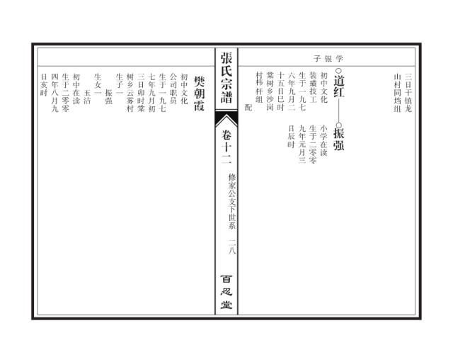 张氏宗谱 子银学 日亥时 四年八月九 生于二零零 初中在读 生女一 生子一 树乡云雾村 三日卯时棠 七年九月初 生于一九七 公司职员 初中文化 樊朝霞 村 棠树乡沙岗 十五日巳时 六年九月二 生于一九七 装璜技工 初中文化 道红 山村同垱组 三日干镇龙 杆组 玉洁 振强 配 卷十二 日辰时 九年元月三 生于二零零 小学在读 振强 修家公支下世系 二八 百忍堂