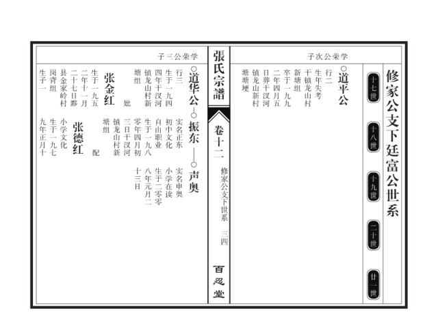生子一 岗背组 县金家岭村 二十七日黟 二年十一月 生于一九五 张金红 塘组 镇龙山村新 四年干汊河 生于一九四 行三 道华公 塘塘埂 镇龙山新村 日葬干汊河 二年四月五 卒于一九九 新塘组 干镇龙山村 生年失考 行二 道平公 修家公支下廷富公世系