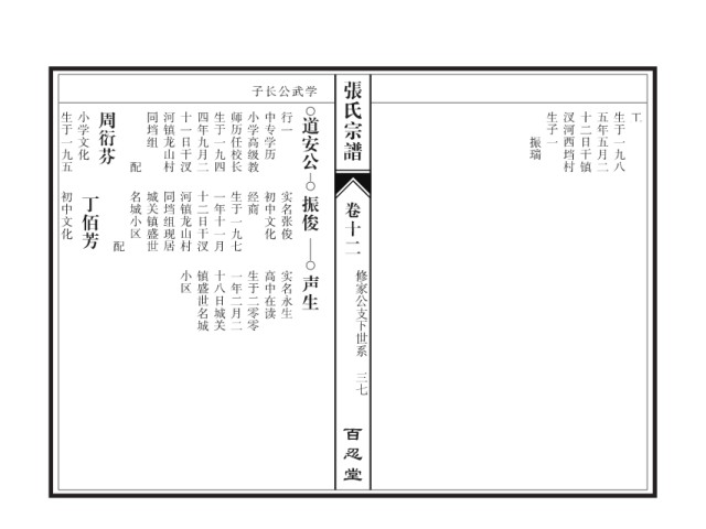 张氏宗谱 子长公武学 生于一九五 小学文化 周衍芬 同垱组 河镇龙山村 十一日干汊 四年九月二 生于一九四 师历任校长 小学高级教 中专学历 行一 道安公 生子一 汊河西垱村 十二日干镇 五年五月二 生于一九八 工 振瑞 配 初中文化 丁佰芳 名城小区 城关镇盛世 同垱组现居 河镇龙山村 十二日干汊 一年十一月 生于一九七 经商 初中文化 实名张俊 振俊 卷十二 配 小区 镇盛世名城 十八日城关 一年二月二 生于二零零 高中在读 实名永生 声生 修家公支下世系 三七 百忍堂