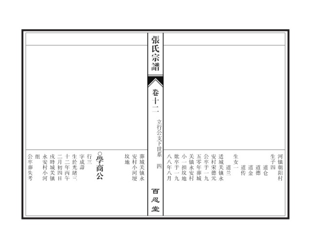 张氏宗谱 卷十二 立行公支下世系 公卒葬失考 组 永安村小河 戌時城关镇 二月初四日 十二年丙午 生於光緒三 字成壽 行三 學商公 坟地 安村小河埂 葬城关镇永 八八年八月 妣卒于一九 小一担坟地 关镇永安村 五零年葬城 公卒于一九 安村宋德元 适城关镇永 生女一 生子四 河镇朝阳村 四 道金 道德 道仓 道兰 道传 百忍堂
