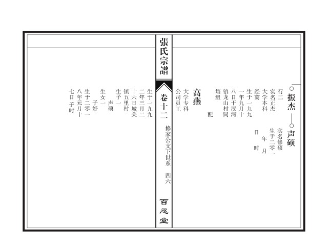 张氏宗谱 七日 八年元月十 生于二零一 生女一 生子一 镇五里村 十六日城关 二年三月二 生于一九九 公司员工 大学专科 高燕 垱组 镇龙山村同 八日干汊河 一年九月十 生于一九九 经商 大学本科 实名正杰 行二 振杰 卷十二 子时 子妤 声硕 配 修家公支下世系 日 年 生于二零一 实名修硕 声硕 时 月 四六 百忍堂