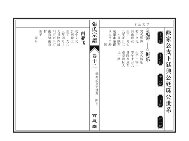 张氏宗谱 子公文学 生子一 村 南市镇南市 阳市兴平市 九日陕西咸 五年四月十 生于一九八 公司职工 初中文化 南亚飞 区人民中路 咸阳市秦都 十六日陕西 九年正月二 生于一九七 自由职业 初中文化 实名张涛 道涛 修家公支下廷興公廷珠公世系 十七世 振乐 配 民中路 市秦都区人 日陕西咸阳 零年十月六 生于二零一 实名恬乐 振乐 卷十二 十八世 修家公支下世系 十九世 二十世 四七 百忍堂 廿一世
