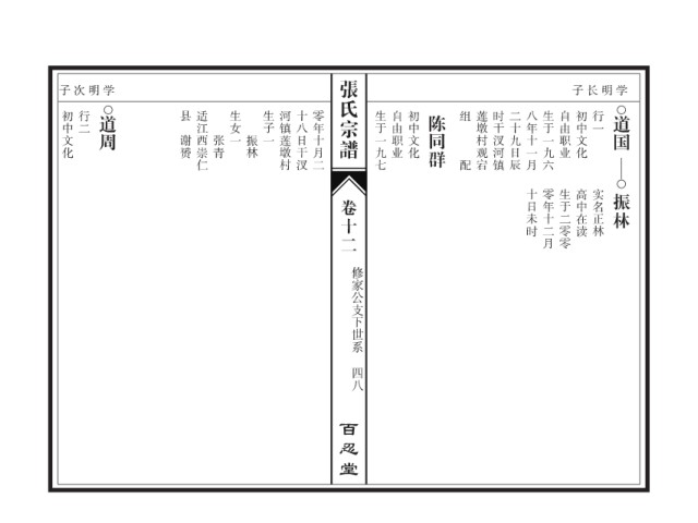 张氏宗谱 子次明学 子长明学 初中文化 行二 道周 县 适江西崇仁 生女一 生子一 河镇莲墩村 十八日干汊 零年十月二 生于一九七 自由职业 初中文化 陈同群 组 莲墩村观宕 时干汊河镇 二十九日辰 八年十一月 生于一九六 自由职业 初中文化 行一 道国 振林 张青 谢赟 配 十日未时 零年十二月 生于二零零 高中在读 实名正林 振林 卷十二 修家公支下世系 四八 百忍堂