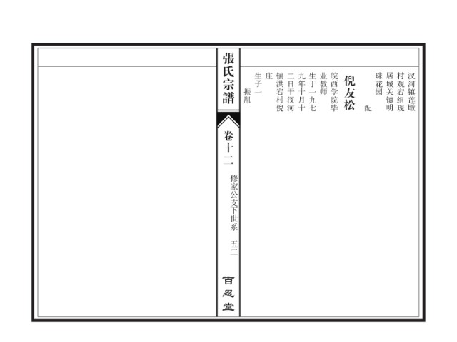 张氏宗谱 生子一 庄 镇洪宕村倪 二日干汊河 九年十月十 生于一九七 业教师 皖西学院毕 倪友松 珠花园 居城关镇明 村观宕组现 汊河镇莲墩 振胤 配 卷十二 修家公支下世系 五二 百忍堂