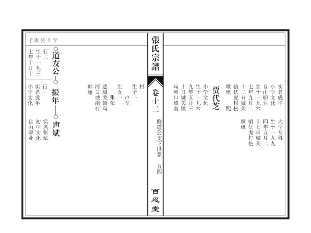张氏宗谱 子次公士学 七年十月十 生于一九三 行二 道友公 小学文化 实名成年 行一 振年 韩超 河口城南村 适城关镇马 生女一 生子一 村 马河口城南 十日城关镇 九年五月三 生于一九六 小学文化 贾代芝 墩组 镇伏虎村松 十二日城关 七年九月二 生于一九六 自由职业 小学文化 实名成平 卷十二 张荣 声军 配 自由职业 初中文化 实名张斌 声斌 修道公支下世系 墩组 镇伏虎村松 十七日城关 四年五月二 生于一九九 大学专科 五四 百忍堂