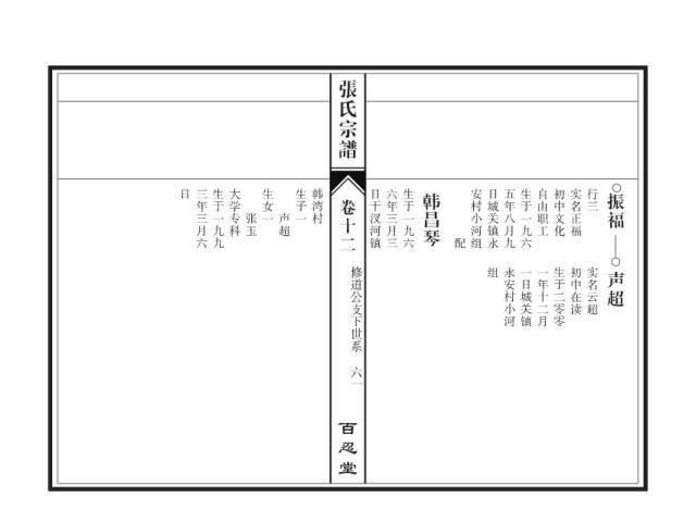 张氏宗谱 日 三年三月六 生于一九九 大学专科 生女一 生子一 韩湾村 日干汊河镇 六年三月三 生于一九六 韩昌琴 安村小河组 日城关镇永 五年八月九 生于一九六 自由职工 初中文化 实名正福 行三 振福 卷十二 张玉 声超 配 修道公支下世系 组 永安村小河 一日城关镇 一年十二月 生于二零零 初中在读 实名云超 声超 六一 百忍堂