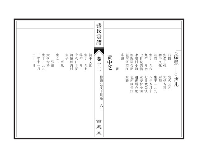 张氏宗谱 二十二日 三年十一月 生于一九九 大学专科 生女 生子一 河镇韩湾村 十八日干汊 零年三月二 生于一九七 初中文化 贾中芝 东路 包河区望江 组现居合肥 永安村小河 七日城关镇 九年三月初 生于一九六 经商 初中文化 实名正强 行四 振强 卷十二 张丽 一 声凡 配 修道公支下世系 东路 包河区望江 组现居合肥 永安村小河 七日城关镇 八年五月十 生于一九九 厨师 大学专科 实名云凡 声凡 六二 百忍堂