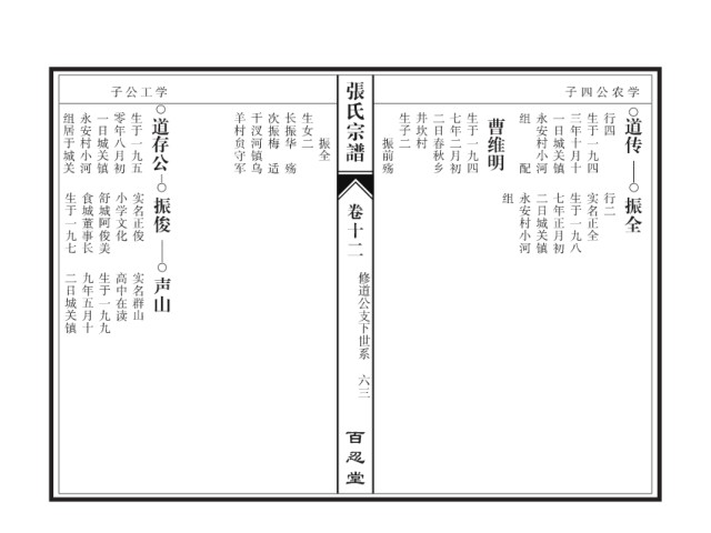 组居于城关 永安村小河 一日城关镇 零年八月初 生于一九五 道存公 羊村贠守军 干汊河镇乌 次振梅 长振华 生女二 生子二 井坎村 二日春秋乡 七年二月初 生于一九四 曹维明 组 永安村小河 一日城关镇 三年十月十 生于一九四 行四 道传