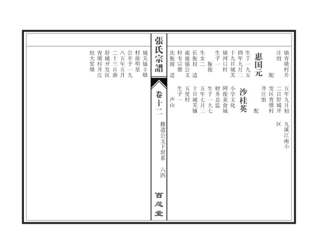 张氏宗谱 组大窑墩 青墩村井庄 舒城开发区 二十三日葬 八五年五月 公卒于一九 村徐明星 城关镇丰墩 次振霞 村韦宗德 南港镇公义 长振权 生女二 生子一 镇河口村 十九日城关 四年九月二 生于一九五 惠国元 庄组 镇青墩村井 振俊 适 配 适 生子一 五里村 十日城关镇 五年七月二 生于一九七 财务总监 阿俊美食城 小学文化 沙桂英 井庄组 发区青墩村 二日舒城开 五年九月初 卷十二 声山 配 修道公支下世系 区 九溪江南小 六四 百忍堂
