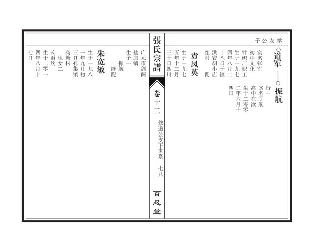 张氏宗谱 子公友学 七日 四年八月十 生于二零一 长雨欣 高塘村 三日孔集镇 一年九月初 生于一九八 朱宽敏 生子一 盐店镇 广元市剑阁 三十日四川 五年十二月 生于一九七 袁凤英 组村 洪宕胡小店 十八日干镇 四年八月二 生于一九七 针织厂职工 初中文化 实名张军 道军 生女二 振航 继配 配 四日 二年六月十 生于二零零 高中在读 实名宇航 行一 振航 卷十二 修道公支下世系 七八 百忍堂