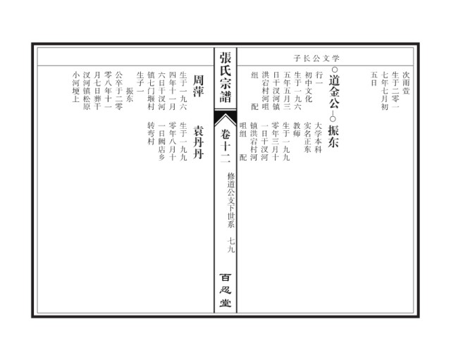 张氏宗谱 子长公文学 小河埂上 汊河镇松原 月七日葬干 零八年十一 公卒于二零 生子一 镇七门堰村 六日干汊河 四年十一月 生于一九六 周萍 组 洪宕村河咀 日干汊河镇 五年五月三 生于一九六 初中文化 行一 道金公 五日 七年七月初 生于二零一 次雨萱 振东 配 转弯村 一日阙店乡 零年八月十 生于一九九 袁丹丹 咀组 镇洪宕村河 一日干汊河 零年三月十 生于一九九 教师 实名正东 大学本科 振东 卷十二 配 修道公支下世系 七九 百忍堂
