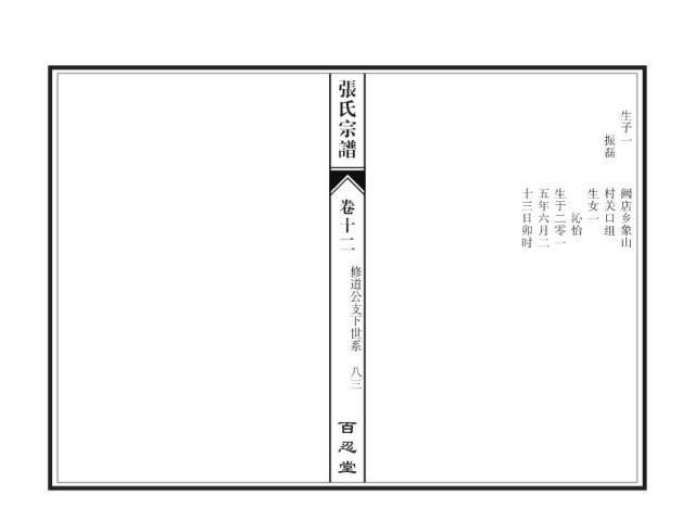 张氏宗谱 生子一 振磊 十三日卯时 五年六月二 生于二零一 生女一 村关口组 阙店乡象山 卷十二 沁怡 修道公支下世系 八三 百忍堂