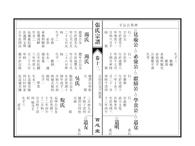 公卒於同治 次適周文周 長適夏信謙 生女二 廷璣爲嗣 承祧與胞弟 生子二 時 二十七日亥 年己丑正月 生於道光九 啟榮公女 湯氏 時 月初六日子 年庚寅十一 生於道光十 字宗文 行一 廷璇公