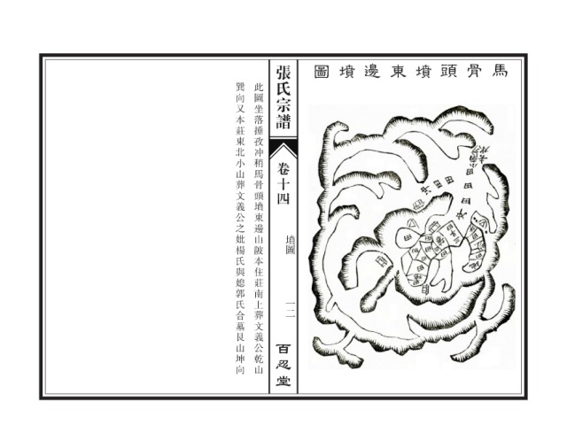 张氏宗谱 圖 墳 邊 東 墳 頭 骨 馬 巽向又本莊東北小山葬文義公之妣楊氏與媳郭氏合墓艮山坤向 此圖坐落捶孜冲稍馬骨頭墳東邊山陂本住莊南上葬文義公乾山 卷十四 墳圖 一二 百忍堂