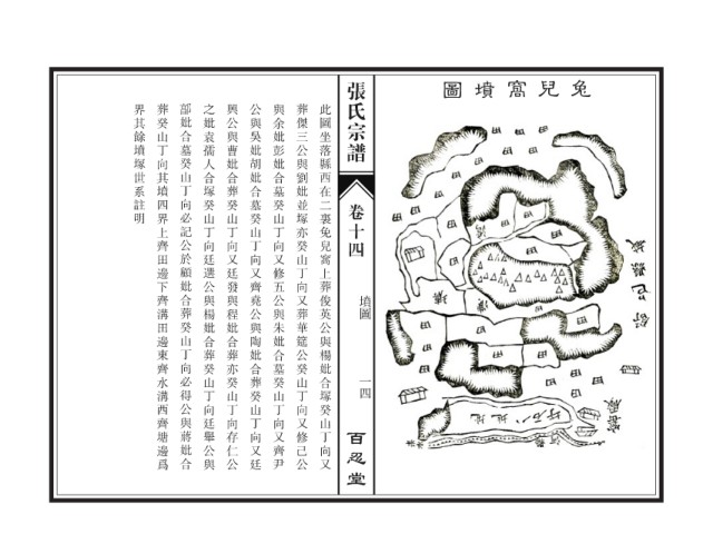 界其餘墳塚世系註明 葬癸山丁向其墳四界上齊田邊下齊溝田邊東齊水溝西齊塘邊爲 之妣袁孺人合塚癸山丁向廷選公與楊妣合葬癸山丁向廷舉公與 興公與曹妣合葬癸山丁向又廷發與程妣合葬亦癸山丁向存仁公 公與吳妣胡妣合墓癸山丁向又齊堯公與陶妣合葬癸山丁向又廷 與余妣彭妣合墓癸山丁向又修五公與朱妣合墓癸山丁向又齊尹 葬傑三公與劉妣並塚亦癸山丁向又葬華筵公癸山丁向又修己公 此圖坐落縣西在二裏免兒窩上葬俊英公與楊妣合塚癸山丁向又