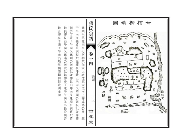 张氏宗谱 圖 墳 柳 柯 七 妣合葬癸丁兼子午向其墳界與護墳田俱載明赤契 妣俱葬艮山坤向又廷謹公與袁妣俱葬癸丁兼子午向又必儉公與曾 側癸丁兼子午向又廷碩公與程妣並葬艮山坤向又廷彥公與曹妣黃 子午向又傑政公與程妣並葬艮坤兼丑未向又華國公與祝妣並葬莊 此圖坐落北四里七柯柳東陶家大墩沈家大墩南上葬成搏公癸丁兼 卷十四 墳圖 一五 百忍堂