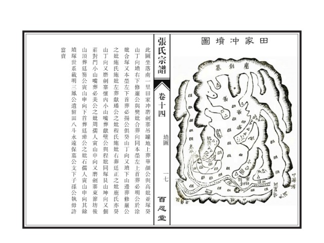 當賣 墳塚世系載明三鳳公遺留田八斗永遠保墓公支下子孫公執毋許 山頂葬廷笏公寅山申向下首葬廷璋公之妣石孺人寅山申向其餘 莊對門小山嘴葬必美公之妣周孺人寅山申向又磨劍寨東節坊後 山丁向又磨劍寨懷內小山嘴葬獻璧公與程妣同塚艮山坤向又佃 之妣施氏施妣左葬獻璠公之妣程氏施妣右葬廷正之妣鹿氏亦癸 妣合塚又本塋左下首葬必揚公俱癸山丁向又墳下山邊葬修巖公 山丁向墳右下修巖公與樊妣合葬向同本塋左上首葬必明公於涂 此圖坐落南一里田家冲磨劍寨吊罐地上葬華顏公與高妣並塚癸