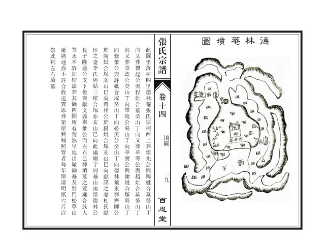 祭此祠左右墳墓 厰熟地亦不許合族送賣添葬架屋興種照管者每年辦清明紙六斤以 等永不許加棺添葬其餘四圍所有荒熟旱地出厰餘基及對門松草山 長子隆盛公支下後裔獻文義舉推公而左右巳葬墳墓之荒灘合族人 恒之妻李氏與姑三棺合塚亦亥山巳向此處廟宇祠基山地係德林公 於陶妣合塚亥山巳向齊相公於段妣合塚亥山巳向獻謨之妻杜氏獻 向修策公與許妣合塚癸山丁向必美公癸山丁向德林菴東葬齊師公 向又葬華蕊公癸山丁向華皖公癸山丁向華實公與謝妣合塚癸山丁 向又葬傑起公與程妣合墓癸山丁向又葬華蕚公與趙妣合墓癸山丁 此圖坐落在四里德林菴張氏宗祠西上葬傑先公與陶妣合墓癸山丁